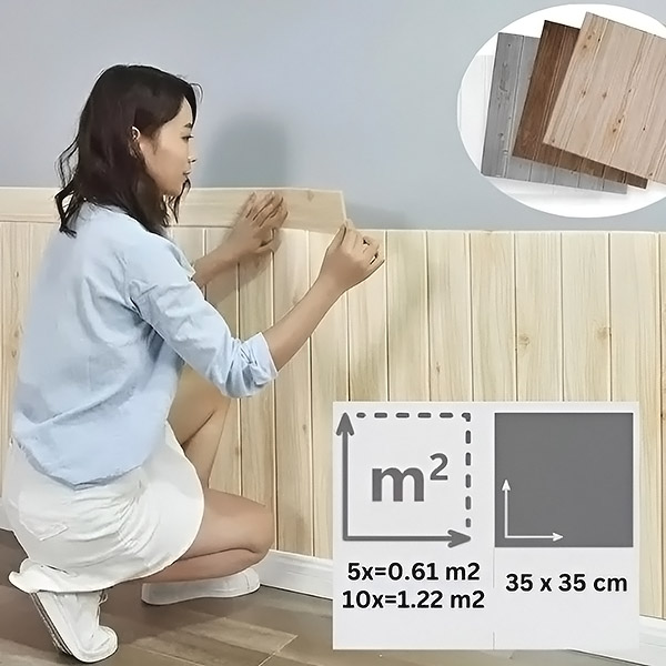 Kiekvienoje pakuotėje yra 5 vienetai (35×35 cm), dengiantys 0,61 m². Prieš pradėdami skaičiuokite, kiek pakuočių jums reikės pagal sienų plotą. Pirkite daugiau pakuočių didesnėms erdvėms ir naudokitės kiekio nuolaidomis!